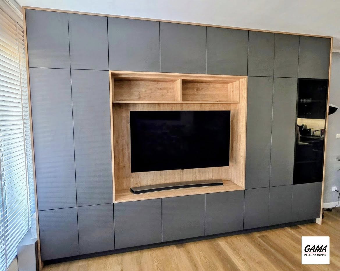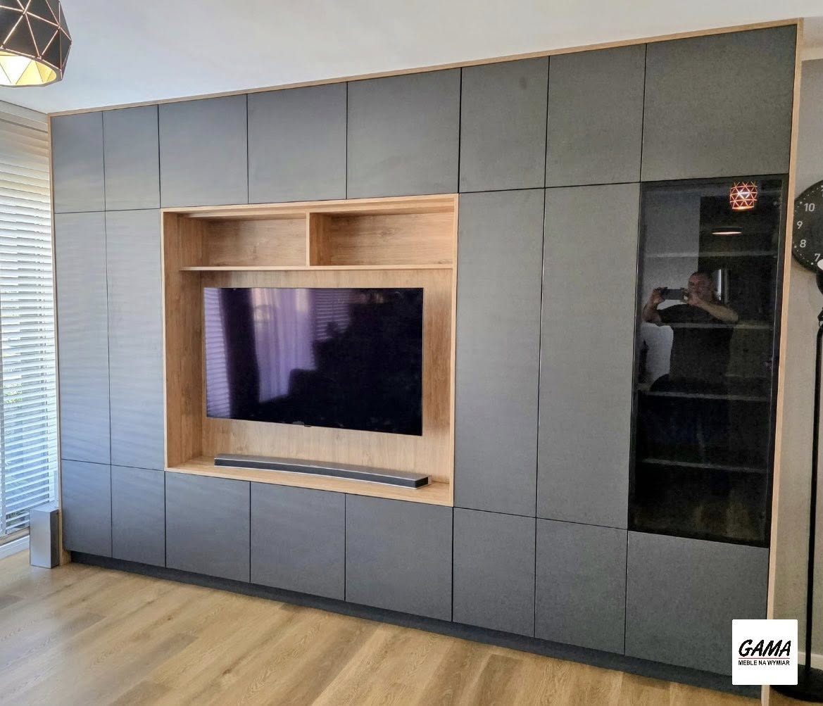 Zabudowa salonu wykonana na wymiar - idealne połączenie Dębu Harbor Złotego i Antracytu.